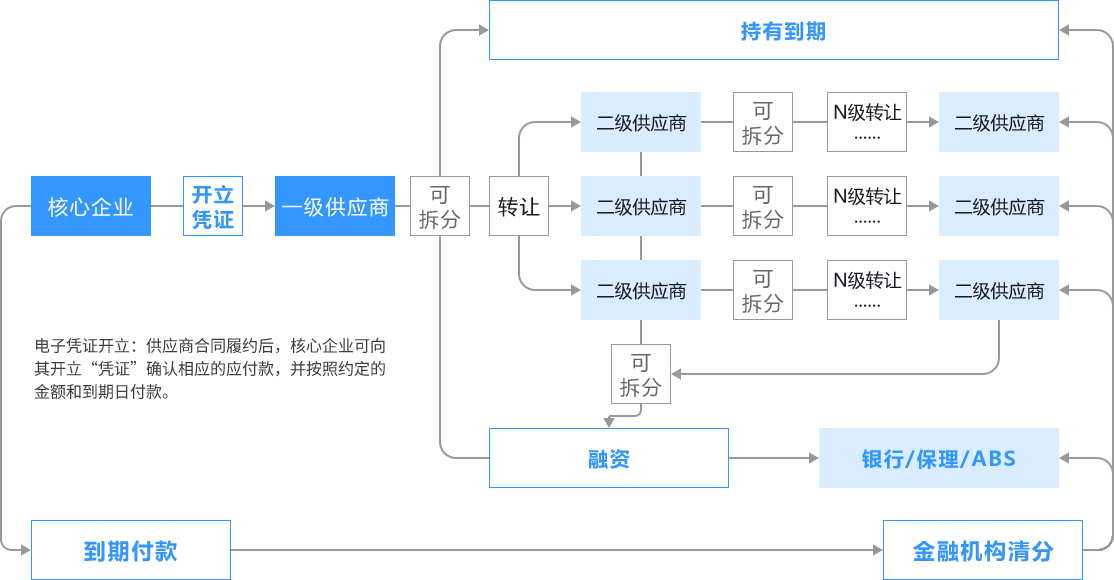 供应商收到电子凭证后,可根据需求进行拆转。流转过程方便、快捷,不占用企业银行授信,不再占用保证金,流转不发生任何费用。